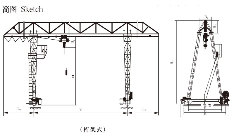 MHh型電動葫蘆門式起重機,整機與CD1型或MD1型電動葫蘆配套使用,適合于露天作業的固定跨間,本機禁止吊運易燃易爆品,根據用戶要求還可以制成單端外伸懸臂式或無懸臂式結構。起重量為1-32T,跨度為7.5-35.5米,工作級別為A3,工作環境溫度為-25℃--40℃。
