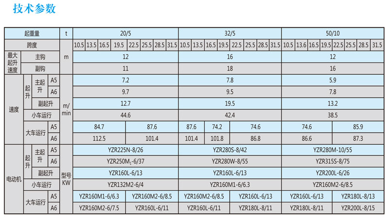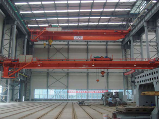 QD型吊鉤橋式起重機(jī),主要由橋架、大車運(yùn)行機(jī)構(gòu)、小車、電器設(shè)備等組成。根據(jù)使用頻繁程度不同,分為A5、A6兩種工作級別。起重量為5-120T,跨度為7.5-35.5米,工作級別為A5—A6,工作環(huán)境溫度為-25℃--40℃。